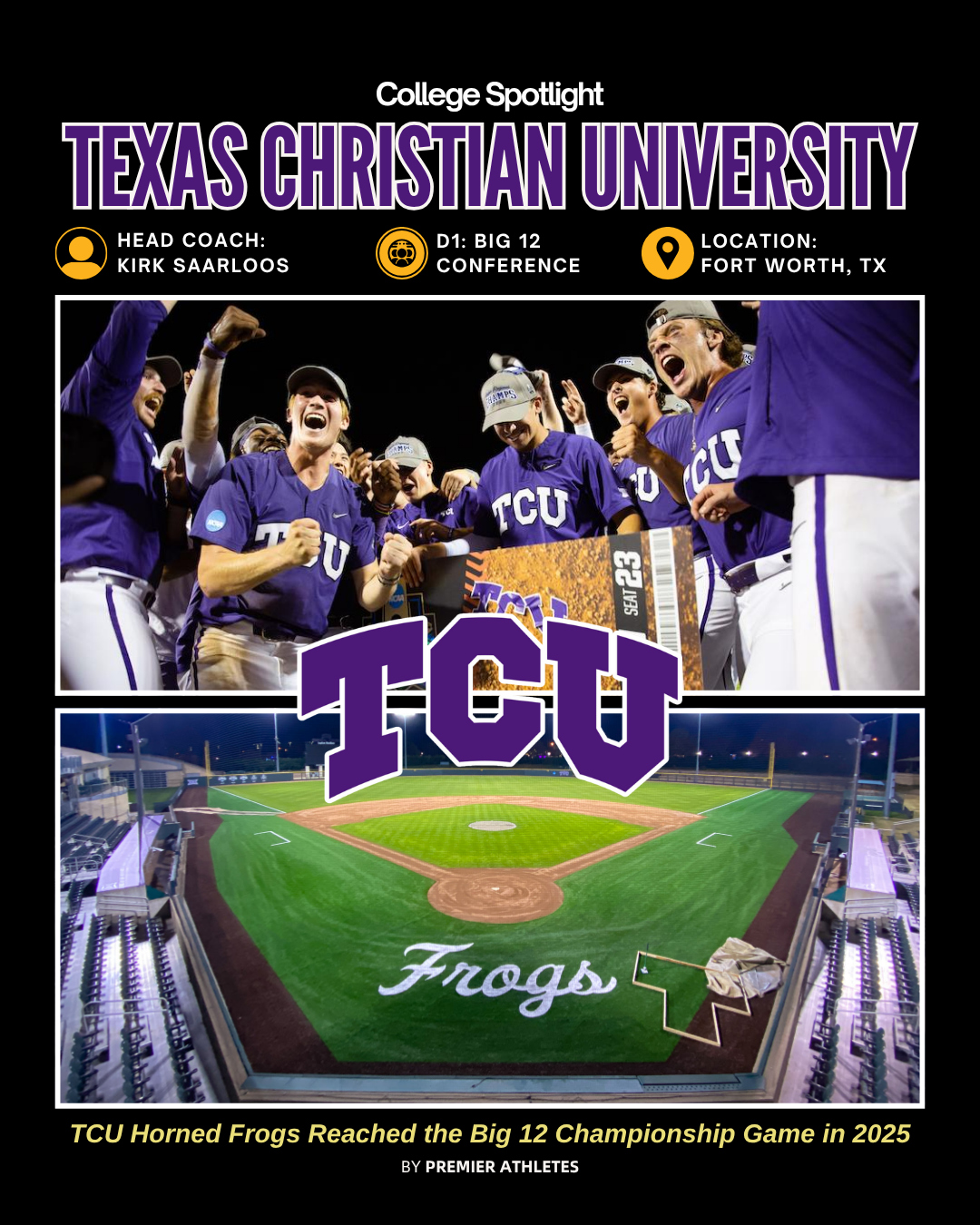 The Saarloos System: TCU emphasizes complete player development with a focus on situational awareness, mental toughness, and clutch performance. The program culture produces players who thrive in pressure situations and compete at the highest levels—a philosophy that translates directly to success beyond college.